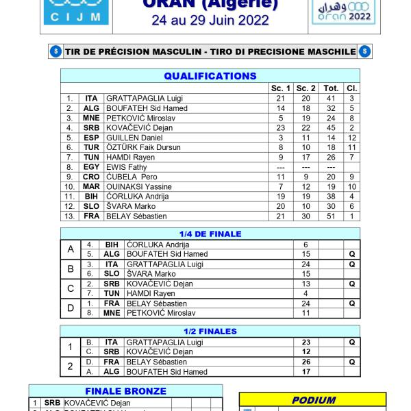 Les jeux méditerranéens se déroulent du 26 au 29 juin 2022 à Oran, en Algérie. Nos athlètes Sébastien Belay, en tir de précision, et Alexandre Chirat, en tir progressif, se sont qualifiés pour les finales des épreuves et tenteront d'aller chercher une médaille d'or pour la France! Rendez-vous mercredi 29 juin pour les finales. Consultez la programmation.
