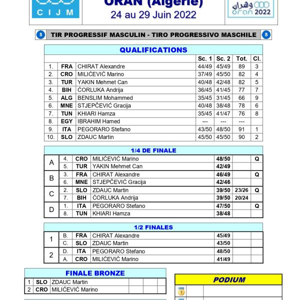 Alexandre Chirat s'est qualifié pour la finale du tir progressif en battant le joueur Slovène 45/49 à 43/50. Il rencontrera l'Italien Pegoraro en finale, vainqueur du croate Milicevic.
