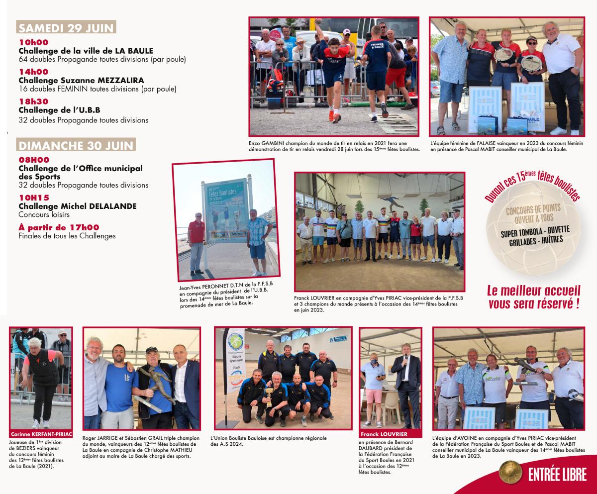 Au programme du mental, du physique et de l'adresse par des démonstrations de tirs sportifs et de précision. Participation au Gentleman des élus, partenaires et joueurs ainsi qu'au Grand Prix Ville de La Baule 64 doubles TD. Le Président de la FFSB, Bernard Daubard, honorera de sa présence cette nouvelle édition de ce grand classique bouliste de la région des Pays de la Loire.