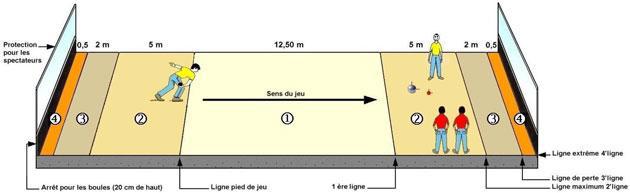 L'un des aspects les plus remarquables du sport-boules est son terrain spécifique. De forme rectangulaire, en terre battue ou en enrobé, il se divise en 7 zones dont les rôles évoluent à mesure que la partie se joue dans un sens ou dans l'autre (le terrain est symétrique). Le terrain peut se trouver en intérieur (boulodrome couvert) comme en extérieur (clos bouliste, stade stabilisé, etc.).
